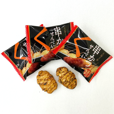 餅米(国産)、濃厚ソース(野菜・果実・糖類・醸造酢・その他)、たまり醤油、澱粉分解物、ソースシーズニング(砂糖・粉末ソース・デキストリン・マヨネーズパウダー・粉末醤油・たん白加水分解物・鰹節エキス・アオサ粉)、紅生姜、砂糖、鰹節粉末、ねぎ、青海苔、鰹節エキス、酵母エキス、昆布エキス/加工デンプン、調味料(アミノ酸等)、アルコール、酸味料、着色料(カラメル色素)、香料、酸化防止剤(V.E)、(一部に小麦・卵・乳成分・ごま・さば・大豆・鶏肉・豚肉・もも・りんごを含む)