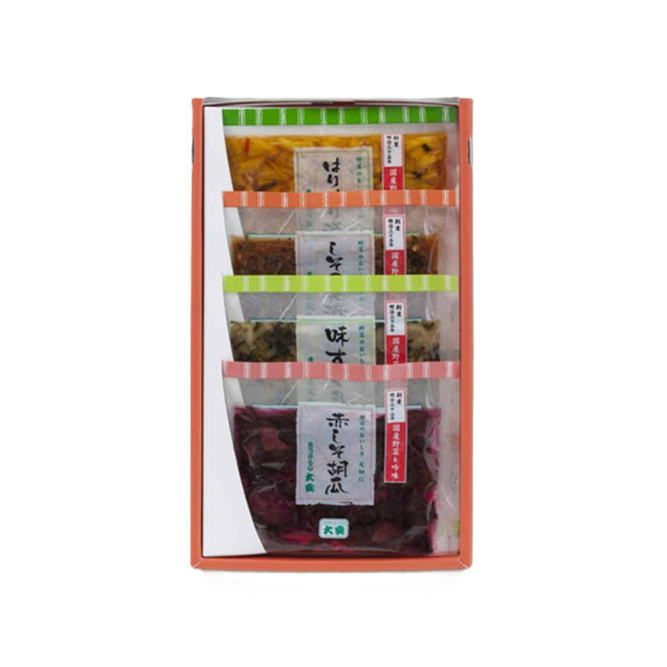 <赤しそ胡瓜>胡瓜、みょうが、生姜、しそ、漬け原材料[還元水あめ、りんご酢、梅酢、醸造酢、みりん、砂糖、食塩、酵母エキス、発酵調味料、昆布エキス]/野菜色素、(一部に小麦・りんごを含む)